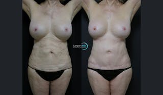 This 74 year old female with a history of a cardiac valve replacement had prior breast implants and body contouring surgery performed many years ago, after her children. Years later, though she stayed active and physically fit, her skin laxity and breast implant position became a problem. The skin redundancy of her abdomen and loss of elasticity also bothered her.
