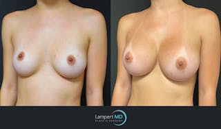 This young lady is 2 month post op after breast augmentation with 300 cc cohesive Silicone gel implants placed in both breasts using sub-glandular implant placement.